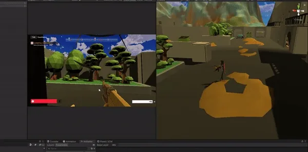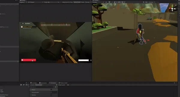 The sniper rifle is a little more challenging because it has an aim. The sniper’s aim would continually alter based on the surroundings, but we also wanted to make sure it would follow the weapon’s animations, especially while reloading the rifle, which was a bit difficult, as you can see below.