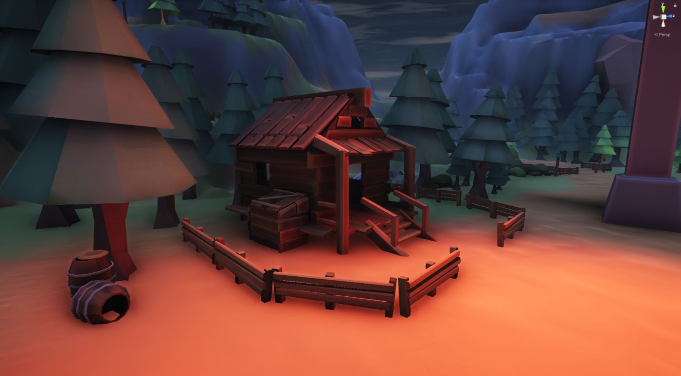 The open area in the middle of the map is where we anticipate the most action. Although it is an open area, there are a few objects like rocks, but not enough to be a good hiding place. This design choice discourages camping and helps the game be more fast-paced. On each side of the open space, there are also small wooden huts with small medic kits that provide a little HP restoration.