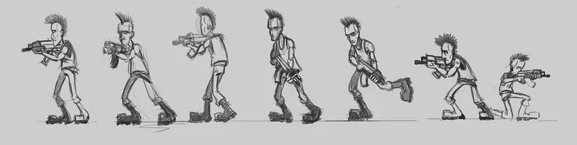 Next to designing the characters, we explored how the characters interact with in-game weapons and how they walk, crouch, run and jump. We made sketches to discuss internally before actually implementing them on Unity, which is the engine we use for our game.