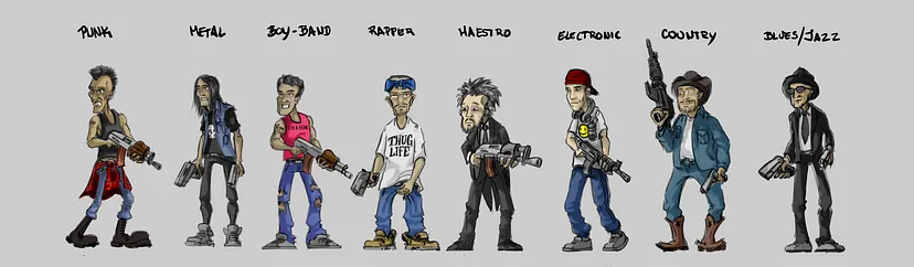First, we decided upon the look of the characters and on the amount there would be in the game. As it is a low-poly game, we want the characters to look cool, fun and a little cartoonish. The urban style embraces many diverse cultures, each with its own unique style. We narrowed it down to 8 characters in the initial phase, although this might change as the game development progresses. The eight character types are: Punk, Metal, Boy-Band, Rapper, Maestro, Electronic, Country and Blues/Jazz.